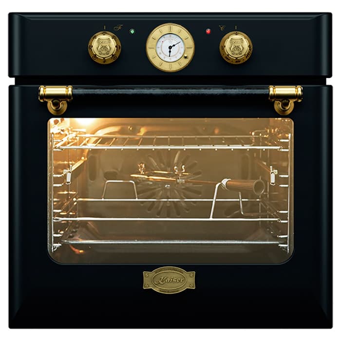 Ретро встраиваемый электрический духовой шкаф Kaiser EH 6424 BE поможет вам приготовить любимые блюда вашей семьи качественно и быстро. Эта модель черного цвета с металлической фурнитурой и часами бронзового цвета будет потрясающе смотреться в интерьере кухни классического стиля, стиля кантри.
