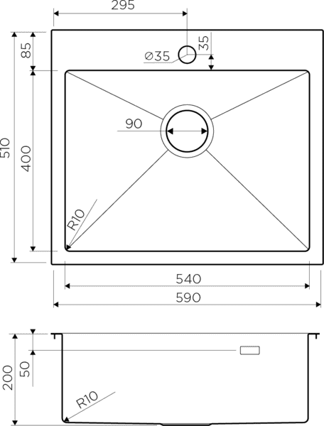 Размер мойки 510 х 590 мм