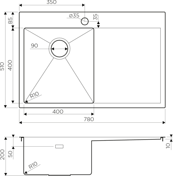 Размер мойки 510 х 780 мм