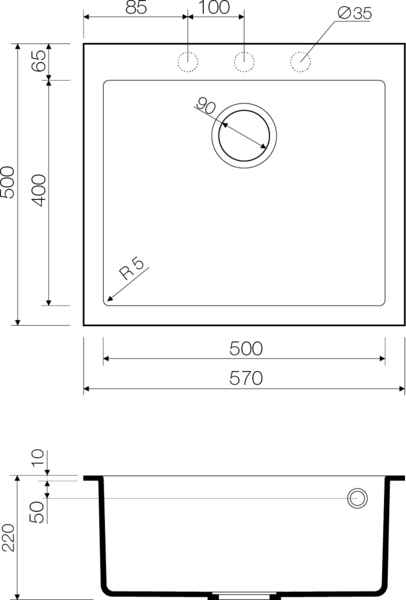Размер мойки 570 х 500 мм