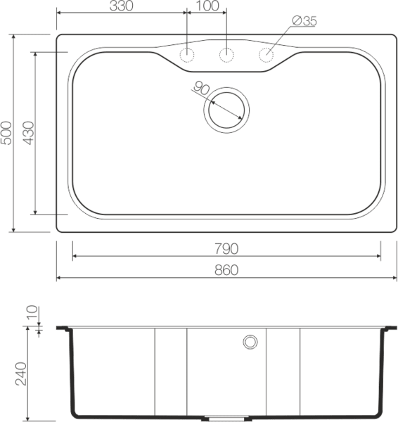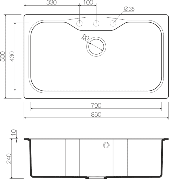 Размер мойки 860 х 500 мм
