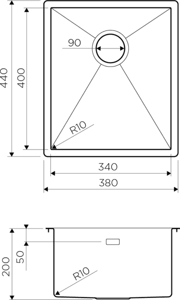 Размер выреза под мойку при монтаже под столешницу 400х340 мм., угловой радиус врезки 10 мм.
