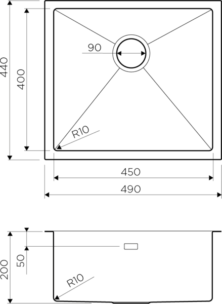 Размер мойки 440 х 490 мм