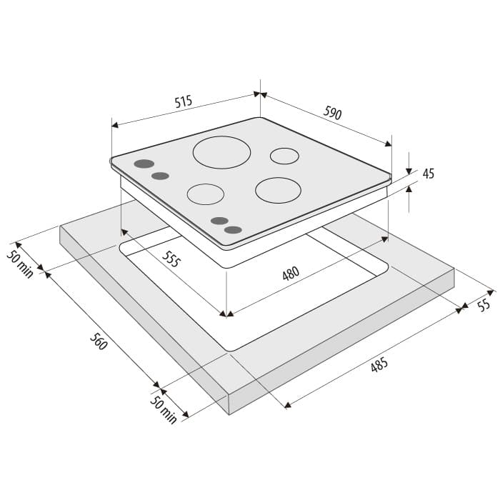Газовая варочная поверхность Krona PARTITA 60 AN может быть установлена в любую кухонную мебель, которая способна противостоять высокой температуре. Размеры ниши выреза, которая будет сделана в поверхности корпуса мебели и минимальные расстояния между задней частью, и прилегающими с боков поверхностями к столешнице.
